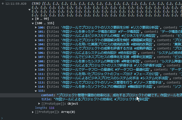 以下は具体的なJavaScriptコードの例です。titleとcontentのフォーマットでオブジェクトの配列にしています。